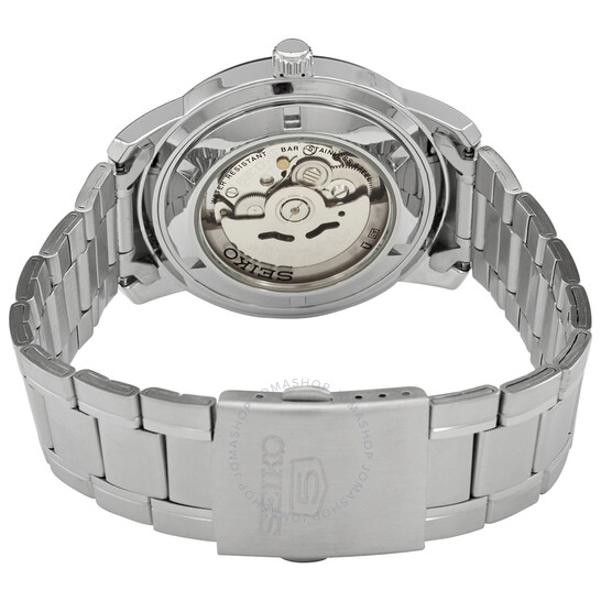 Vỏ thép không gỉ với một vòng đeo tay bằng thép không gỉ. Cố định viền thép không gỉ. Mặt số màu đen với bàn tay tông màu bạc và điểm đánh dấu giờ. Các điểm đánh dấu phút của tiếng Ả Rập (trong khoảng thời gian 5 phút). Điểm đánh dấu phút xung quanh vành ngoài. Loại quay số: Analog. Bàn tay phát quang và điểm đánh dấu. Ngày trong tuần và ngày hiển thị tại vị trí 3 giờ. Chuyển động tự động. Tinh thể cứng chống trầy xước. Kéo / Đẩy vương miện. Trường hợp minh bạch trở lại. Hình dạng hình tròn. Kích thước trường hợp: 43 mm. Độ dày trường hợp: 11 mm. Chiều rộng băng tần: 21 mm. CLASP triển khai với phát hành nút nhấn. Kháng nước ở 50 mét / 165 feet. Chức năng: Ngày, ngày, giờ, phút, thứ hai. SEIKO 5 SERIES. Phong cách đồng hồ thông thường. Seiko Seiko 5 tự động quay số đen đồng hồ nam SNKM87.