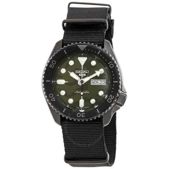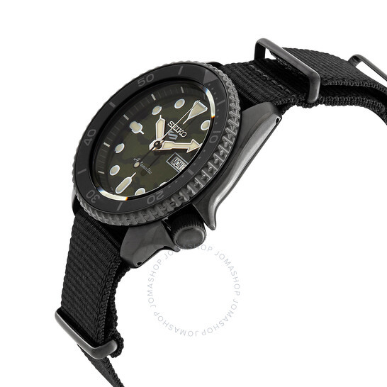 Vỏ thép không gỉ màu đen với dây đeo nylon màu đen. Khung thép không gỉ màu đen xoay. Quay số màu xanh lá cây với bàn tay tông màu bạc và điểm đánh dấu giờ. Loại quay số: Analog. Bàn tay phát quang và điểm đánh dấu. Ngày trong tuần và ngày hiển thị tại vị trí 3 giờ. Chuyển động tự động. Tinh thể cứng chống trầy xước. Trường hợp rắn trở lại. Hình dạng trường hợp tròn, Kích thước trường hợp: 42,5 mm, Độ dày trường hợp: 13,4 mm. Chiều rộng băng tần: 22 mm. Tang clasp. Kháng nước ở 100 mét / 330 feet. Chức năng: Ngày, ngày, giờ, phút, thứ hai. Sê -ri thể thao Seiko 5. Phong cách theo dõi thể thao. Seiko Seiko 5 Thể thao tự động quay số màu xanh lá cây nam SRPJ37.