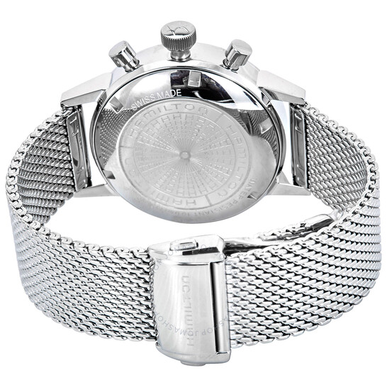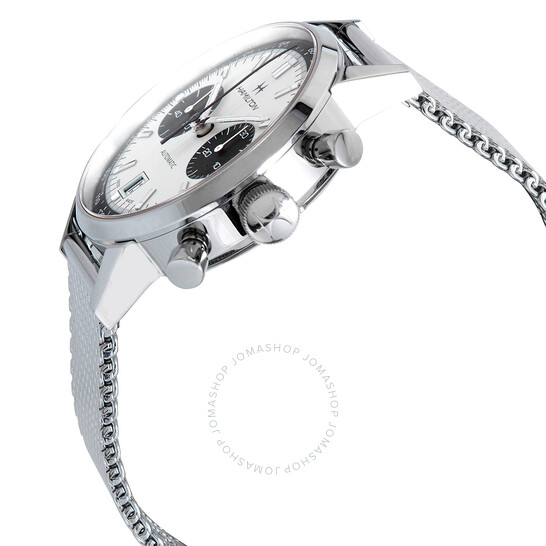 Vỏ thép không gỉ với vòng tay lưới bằng thép không gỉ. Cố định viền thép không gỉ. Mặt số trắng với bàn tay tông màu bạc phát sáng và điểm đánh dấu giờ chỉ số. Điểm đánh dấu phút. Đánh dấu tachymeter xung quanh vành ngoài. Loại quay số: Analog. Bàn tay phát quang và điểm đánh dấu. Hiển thị ngày ở vị trí 6 giờ. Chronograph – Hai hộp số phụ màu đen hiển thị: 30 phút và 60 giây. Hamilton Calibre H-31 Chuyển động tự động, dựa trên ETA 7753, chứa 27 viên ngọc, cắn ở mức 28800 VPH và có dự trữ năng lượng khoảng 60 giờ. Tinh thể sapphire chống trầy xước. Kéo / Đẩy vương miện. Trường hợp rắn trở lại. Hình dạng hình tròn. Kích thước trường hợp: 40 mm. Chiều rộng băng tần: 20 mm. Gấp qua trượt qua clasp. Kháng nước ở 100 mét / 330 feet. Chức năng: Chronograph, tachymeter, ngày, giờ, phút, thứ hai. Sê -ri cổ điển Mỹ. Phong cách theo dõi thể thao. Nhãn xem: Thụy Sĩ làm. Hamilton American Classic Chronograph Automatic Quay số nam H38416111.