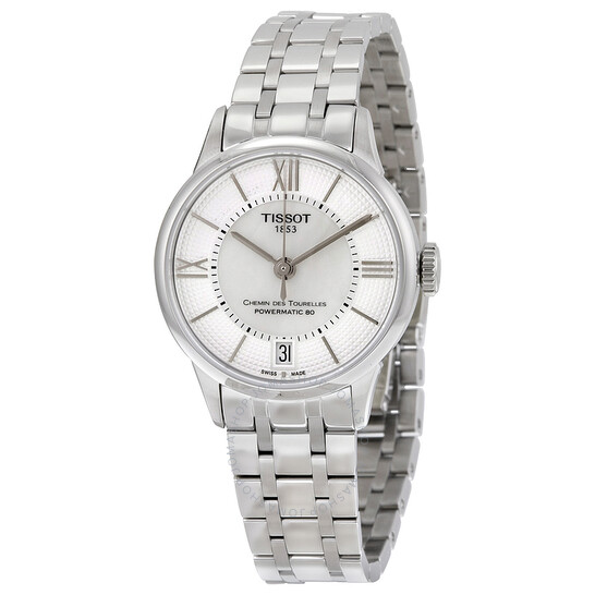 Vỏ thép không gỉ với một vòng đeo tay bằng thép không gỉ. Cố định viền thép không gỉ. Bạc và mẹ của Pearl Dial với bàn tay tông màu bạc và điểm số chỉ số. Số La Mã đánh dấu các vị trí 3, 9 và 12 giờ. Điểm đánh dấu xung quanh một vòng bên trong. Loại quay số: Analog. Hiển thị ngày ở vị trí 6 giờ. Tissot Calibre Powermatic 80.111 Chuyển động tự động với dự trữ năng lượng 80 giờ. Tinh thể sapphire tổng hợp chống trầy xước. Kéo / Đẩy Crown.Transarent Case trở lại. Kích thước trường hợp: 32 mm. Độ dày trường hợp: 10,69 mm. Hình dạng hình tròn. Chiều rộng băng tần: 21 mm. Chiều dài dải: 9 inch. Ẩn gấp trên clasp. Kháng nước ở 50 mét / 165 feet. Chức năng: Ngày, giờ, phút, thứ hai. Phong cách đồng hồ thông thường. Nhãn xem: Thụy Sĩ làm. Tissot Chemin des Tourelles Automatic Ladies xem T0992071111800