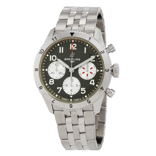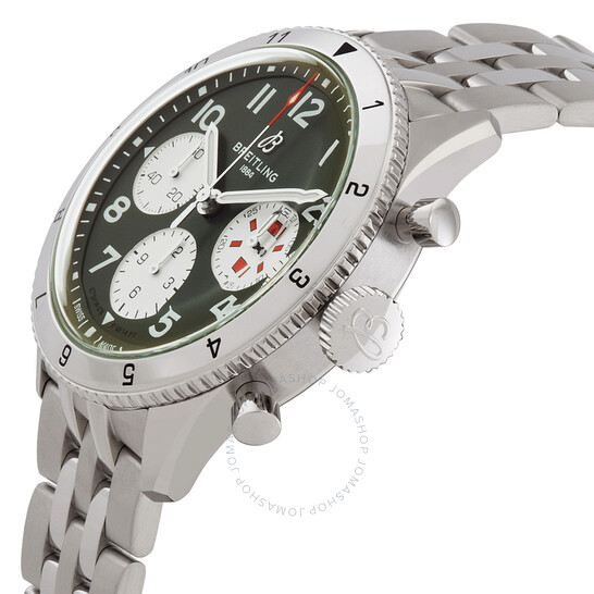 Vỏ thép không gỉ và vòng đeo tay. Bizel thép không gỉ xoay hai chiều. Quay số màu xanh lá cây với các điểm đánh dấu số số chỉ số-Ả Rập. Điểm đánh dấu phút xung quanh vành ngoài. Loại quay số: Analog. Bàn tay phát quang và điểm đánh dấu. Chronograph – Ba quay số phụ hiển thị: 60 giây, 60 phút và 12 giờ. Breitling Calibre B23 Chuyển động tự động với dự trữ năng lượng 48 giờ. Tinh thể sapphire chống trầy xước. Kéo / Đẩy vương miện. Trường hợp rắn trở lại. Hình dạng trường hợp tròn, kích thước trường hợp: 42 mm, Độ dày trường hợp: 14,7 mm. Chiều rộng băng tần: 22 mm. Khóa triển khai clasp. Kháng nước ở 100 mét / 330 feet. Chức năng: Chronograph, giờ, phút, thứ hai. Thông tin bổ sung: hộp gốc, thẻ bảo hành quốc tế, hướng dẫn sử dụng (phụ kiện hoàn chỉnh). Sê -ri AVI cổ điển. Phong cách theo dõi thể thao. Nhãn xem: Thụy Sĩ làm. Breitling Classic Avi 42 Curtiss Warhawk Chronograph Automatic Dial Dial Men Watch A233802A1L1A1.