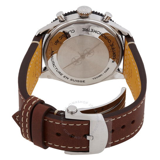 Vỏ thép không gỉ màu bạc với dây đeo bằng da bê màu nâu. Bizel thép không gỉ màu đen xoay hai chiều. Mặt số màu đen với bàn tay phát sáng và các điểm đánh dấu số số của Anh-Ả Rập. Điểm đánh dấu phút xung quanh vành ngoài. Loại quay số: Analog. Bàn tay phát quang. Chronograph – Ba quay số phụ hiển thị: 60 giây, 30 phút và 12 giờ. Breitling Calibre B23 Chuyển động tự động với dự trữ năng lượng 48 giờ. Tinh thể sapphire chống trầy xước. Kéo / Đẩy vương miện. Trường hợp rắn trở lại. Hình dạng trường hợp tròn, kích thước trường hợp: 42 mm, Độ dày trường hợp: 14,7 mm. Chiều rộng băng tần: 22 mm. Triển khai với clasp phát hành nút nhấn. Kháng nước ở 100 mét / 330 feet. Chức năng: Chronograph, giờ, phút, thứ hai. Sê -ri AVI cổ điển. Phong cách theo dõi thể thao. Nhãn xem: Thụy Sĩ làm. Breitling Classic AVI Chronograph Tự động Dial BREAL MAN WATCH Y233801A1B1X1.