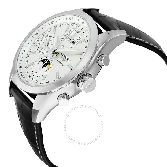 Vỏ thép không gỉ với dây đeo bằng da màu nâu (cá sấu). Cố định viền thép không gỉ. Mặt số trắng với bàn tay tông màu bạc phát sáng và điểm đánh dấu giờ chỉ số. Thang điểm ngày. Điểm đánh dấu phút xung quanh vành ngoài. Loại quay số: Analog. Bàn tay phát quang. Hoàn thành Lịch – Ngày hiển thị của Trung tâm hiển thị trong tuần và tháng. Chronograph – Ba quay số phụ hiển thị: kép 60 giây / 24 giờ, kép 12 giờ / moonphase và 30 phút. Longines Calibre L678 Chuyển động tự động với dự trữ năng lượng 48 giờ. Tinh thể sapphire chống trầy xước. Kéo / Đẩy vương miện. Trường hợp minh bạch trở lại. Hình dạng hình tròn. Kích thước trường hợp: 42 mm. Độ dày trường hợp: 14,5 mm. Chiều rộng băng tần: 21 mm. Gấp qua clasp với một bản phát hành nút nhấn. Kháng nước ở 50 mét / 165 feet. Các chức năng: Giai đoạn Mặt trăng, Đồng hồ bấm giờ, Tháng, Ngày, Ngày, GMT, Múi giờ thứ hai, Giờ, Phút, Thứ hai, Ngày/Đêm. Phong cách theo dõi thể thao. Nhãn xem: Thụy Sĩ làm. Longines chinh phục đồng hồ bấm giờ tự động đồng hồ nam L27984723.