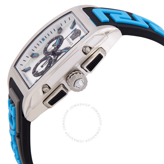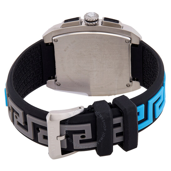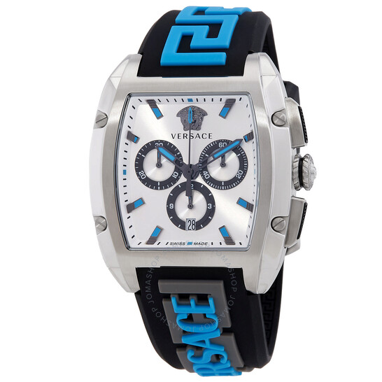 Vỏ thép không gỉ màu bạc với dây đeo silicon màu đen và xanh. Cố định viền thép không gỉ tông màu bạc. Mặt số bạc với bàn tay đen và điểm số chỉ số. Điểm đánh dấu phút xung quanh vành ngoài. Loại quay số: Analog. Bàn tay phát quang và điểm đánh dấu. Hiển thị ngày ở vị trí 6 giờ. Chronograph – Ba quay số phụ hiển thị: 60 giây, 30 phút và 12 giờ. Chuyển động Quartz. Tinh thể sapphire chống trầy xước. Kéo / Đẩy vương miện. Trường hợp rắn trở lại. Hình dạng trường hợp Tonneau, Kích thước trường hợp: 42 x 49,5 mm. Khóa clasp. Kháng nước ở 50 mét / 165 feet. Chức năng: Chronograph, ngày, giờ, phút, thứ hai. Sê -ri Dominus. Phong cách theo dõi thể thao. Nhãn xem: Thụy Sĩ làm. Versace Dominus Chronograph Quartz Bạc Dial Men Watch VE6H00123.