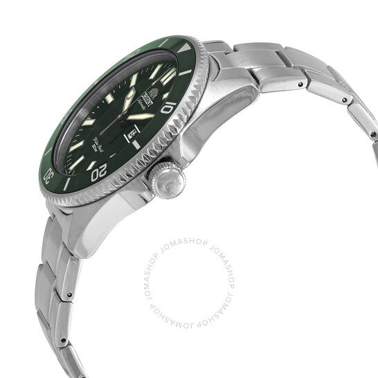 Vỏ thép không gỉ với một vòng đeo tay bằng thép không gỉ. Vòng thép không gỉ xoay đơn hướng với vòng màu xanh lá cây. Mặt số màu xanh lá cây với bàn tay hình thanh kiếm màu bạc và điểm số chỉ số. Quy mô phút xung quanh vành bên trong. Loại quay số: Analog. Bàn tay phát quang và điểm đánh dấu. Ngày trong tuần và ngày hiển thị tại vị trí 3 giờ. Phương Đông Calibre F6922 Chuyển động tự động, chứa 22 viên ngọc, cắn ở mức 21600 VPH và có dự trữ năng lượng khoảng 40 giờ. Tinh thể khoáng chất chống trầy xước. Vít xuống vương miện. Trường hợp rắn trở lại. Hình dạng hình tròn. Kích thước trường hợp: 44 mm. Độ dày trường hợp: 13 mm. Chiều rộng băng tần: 22 mm. CLASP triển khai với phát hành nút nhấn. Kháng nước ở 200 mét / 660 feet. Chức năng: Ngày, ngày, giờ, phút, thứ hai. Sê -ri Kanno. Phong cách đồng hồ lặn. Nhãn đồng hồ: Nhật Bản Movt. Phương Đông Kanno tự động quay số xanh đồng hồ nam RA-AA0914E19B.