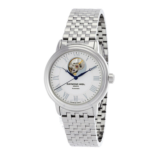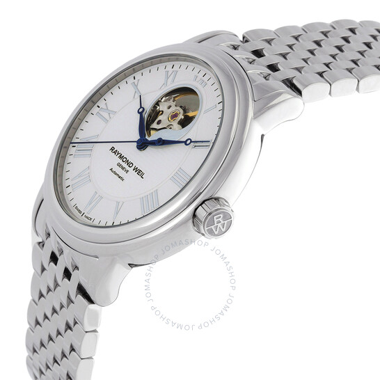Vỏ thép không gỉ màu bạc và vòng đeo tay. Cố định viền thép không gỉ tông màu bạc. Quay số trắng với bàn tay màu xanh và điểm đánh dấu giờ La Mã. Điểm đánh dấu phút xung quanh vành ngoài. Loại quay số: Analog. Chuyển động tự động. Tinh thể sapphire chống trầy xước. Kéo / Đẩy vương miện. Trường hợp minh bạch trở lại. Hình dạng trường hợp tròn, kích thước trường hợp: 39,5 mm. Gấp qua clasp với một bản phát hành an toàn. Kháng nước ở 50 mét / 165 feet. Chức năng: Giờ, phút, thứ hai. Sê -ri Maestro. Phong cách đồng hồ ăn mặc. Nhãn xem: Thụy Sĩ làm. Raymond Weil Maestro Automatic Quay số nam Đồng hồ nam 2827-ST-00308.