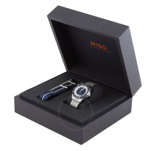 Vỏ thép không gỉ màu bạc và vòng đeo tay. Vòng thép không gỉ màu xanh. Quay số màu xanh với bàn tay tông màu bạc và điểm đánh dấu giờ. Điểm đánh dấu phút xung quanh vành ngoài. Loại quay số: Analog. Bàn tay phát quang và điểm đánh dấu. Hiển thị ngày ở vị trí 3 giờ. Mido Calibre 80 Chuyển động tự động với dự trữ năng lượng 80 giờ. Tinh thể sapphire chống trầy xước. Vít xuống vương miện. Trường hợp rắn trở lại. Hình dạng trường hợp tròn, Kích thước trường hợp: 40,5 mm, Độ dày trường hợp: 13,4 mm. Chiều rộng băng tần: 21 mm. Gấp qua clasp với một bản phát hành an toàn. Kháng nước ở 200 mét / 660 feet. Chức năng: GMT, ngày, giờ, phút, thứ hai. Sê -ri Ocean Star. Phong cách theo dõi thể thao. Nhãn xem: Thụy Sĩ làm. Biến thể vật phẩm: M0268291804100. Mido Ocean Star GMT Tự động Dial Blue Dial Watch M026.829.18.041.00.