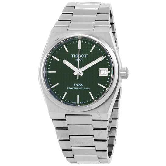 Vỏ thép không gỉ màu bạc và vòng đeo tay. Cố định viền thép không gỉ tông màu bạc. Quay số màu xanh lá cây với bàn tay tông màu bạc và điểm đánh dấu giờ. Điểm đánh dấu phút xung quanh vành ngoài. Loại quay số: Analog. Hiển thị ngày ở vị trí 3 giờ. Chuyển động tự động. Tinh thể sapphire chống trầy xước. Trường hợp minh bạch trở lại. Hình dạng trường hợp tròn, Kích thước trường hợp: 35 mm, Độ dày trường hợp: 10,93 mm. Kháng nước ở 100 mét / 330 feet. Chức năng: Ngày, giờ, phút, thứ hai. Sê -ri PRX. Phong cách đồng hồ thông thường. Nhãn xem: Thụy Sĩ làm. Tissot PRX tự động quay số xanh unisex Xem T1372071109100.