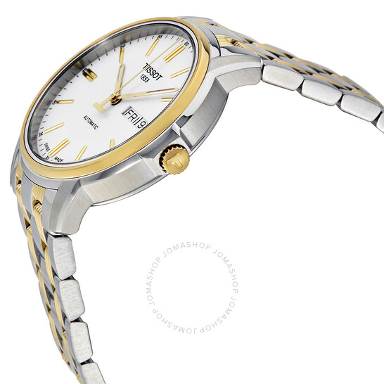 Vỏ thép không gỉ với vòng đeo tay bằng thép không gỉ hai tông màu (tông màu bạc và vàng vàng). Đã sửa lỗi hai tông màu (tông màu bạc và vàng vàng). Quay số trắng với bàn tay màu vàng vàng và điểm số chỉ số. Điểm đánh dấu phút xung quanh vành ngoài. Loại quay số: Analog. Ngày trong tuần và ngày hiển thị tại vị trí 3 giờ. ETA caliber 2836-2 Chuyển động tự động, dựa trên ETA 2824-2, chứa 25 đồ trang sức, cắn ở mức 28800 VPH và có dự trữ năng lượng khoảng 40 giờ. Tinh thể sapphire chống trầy xước. Kéo / Đẩy vương miện. Trường hợp bộ xương trở lại. Hình dạng hình tròn. Kích thước trường hợp: 40 mm. Độ dày trường hợp: 9,5 mm. Chiều rộng băng tần: 19 mm, chiều dài băng tần: 8,5 inch. Bướm clasp. Chống nước ở 30 mét / 100 feet. Chức năng: Ngày, ngày, giờ, phút, thứ hai. Sê -ri Automatic III. Phong cách đồng hồ thông thường. Nhãn xem: Thụy Sĩ làm. Biến thể vật phẩm: T065.430.22.031.00. Tissot T-Classic Automatic III White Dial Watch nam T0654302203100.