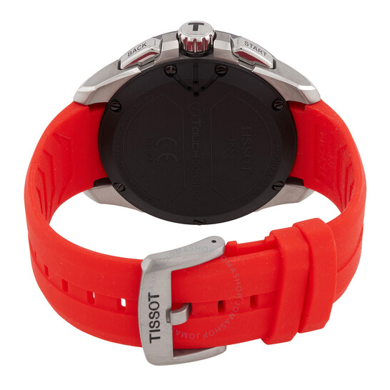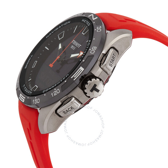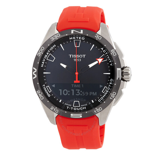 Trường hợp titan với dây đeo silicon màu đỏ. BEZEL GERAMIC PVD ĐEN. Mặt số màu đen với bàn tay đen và điểm số chỉ số. Điểm đánh dấu phút xung quanh vành ngoài. Loại quay số: kỹ thuật số tương tự. Bàn tay phát quang và điểm đánh dấu. Lịch vĩnh viễn. ETA Calibre E32.001 Chuyển động Quartz. Tinh thể sapphire chống trầy xước. Trường hợp rắn trở lại. Hình dạng trường hợp tròn, kích thước trường hợp: 47,5 mm, Độ dày trường hợp: 15,3 mm. Chiều rộng băng tần: 23 mm. Tang clasp. Kháng nước ở 100 mét / 330 feet. Các chức năng: Lịch vĩnh viễn, đồng hồ bấm giờ, báo động, tháng, ngày, ngày, GMT, múi giờ thứ hai, giờ, phút, thứ hai, bluetooth, nhiệt kế, chỉ báo độ cao, phong vũ biểu, la bàn, bộ nhớ, chạy bằng năng lượng mặt trời. Sê-ri T-Touch. Phong cách theo dõi thể thao. Nhãn xem: Thụy Sĩ làm. Tissot T-Touch báo động vĩnh viễn Chronograph Quartz Digital-Digital Black Dial Watch nam T121.420.47.051.01.